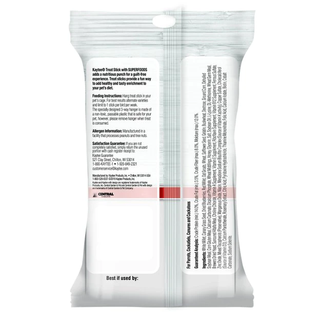 Feed your feathered friend the wholesome goodness of Kaytee Avian Superfood Treat Stick Blueberry Bird Treat! These nutritious goodies are filled with real, recognizable ingredients, including seeds, grains and an added blueberry superfood topping. These ingredients are nutritionally fortified with vitamins and minerals and are best for medium to large pet birds!
