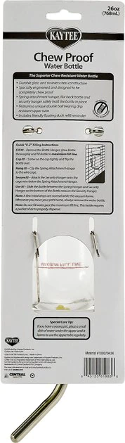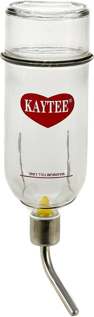 The Kaytee Chew-Proof Small Animal Water Bottle is an extremely durable chew-resistant water bottle for your small animal cage. The main reservoir is made of glass, and the sipper tube and cap are stainless steel. It comes with a spring attachment hanger that securely holds the bottle in place inside or outside any small animal wire home. The Kaytee Chew-Proof water bottle features a double ball bearing sipper tube that makes it drip-resistant and a floating duck that serves as a reminder to refill the water supply.