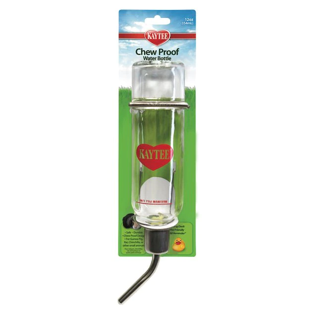 Keep your small sidekick’s water supply safe with the Kaytee Chew-Proof Water Bottle. This water bottle for small pets is constructed using clear glass and stainless steel. It features a spring attachment hanger to hold the bottle securely in your buddy’s wire habitat. This chew-proof water bottle is equipped with a unique double-ball bearing sipper tube that’s drip resistant as well as a fun floating duck reminder. It’s paw-fect for your rabbit, ferret, guinea pig, chinchilla and more.