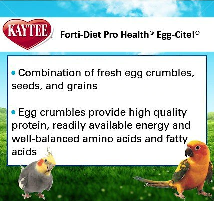 Feed your parakeet a diet rich in protein from real egg crumbles with Kaytee Egg-Cite! Forti-Diet Pro Health Parakeet Bird Food. Parakeets and other caged birds need a well-balanced, low-fat, healthy diet with vitamins, minerals and protein to stay healthy. Kaytee Egg-Cite! Forti-Diet Pro Health Parakeet Bird Food provides those nutrients with real egg crumbles, a mix of grass and plant seed and pellets fortified with vitamins and minerals. It is highly palatable and is designed to be your bird’s primary food source, not a supplement like other egg-based bird foods. Feed one to three tablespoons a day and discard any uneaten portions before next feeding.