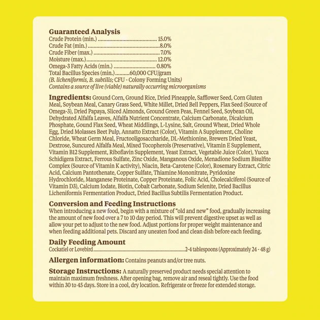 Ground Corn, Ground Rice, Dried Pineapple, Safflower Seed, Corn Gluten Meal, Soybean Meal, Canary Grass Seed, White Millet, Dried Bell Peppers, Flax Seed (Source of Omega-3), Dried Papaya, Sliced Almonds, Ground Green Peas, Fennel Seed, Soybean Oil, Dehydrated Alfalfa Leaves, Alfalfa Nutrient Concentrate, Calcium Carbonate, Dicalcium Phosphate, Ground Flax Seed, Wheat Middlings, L-Lysine, Salt, Ground Wheat, Dried Whole Egg, Dried Molasses Beet Pulp, Annatto Extract (Color), Vitamin A Supplement, Choline Chloride, Wheat Germ Meal, Fructooligosaccharide, DL-Methionine, Brewers Dried Yeast, Dextrose, Suncured Alfalfa Meal, Mixed Tocopherols (Preservative), Vitamin E Supplement, Vitamin B12 Supplement, Riboflavin Supplement, Yeast Extract, Vegetable Juice (Color), Yucca Schidigera Extract, Ferrous Sulfate, Zinc Oxide, Manganous Oxide, Menadione Sodium Bisulfite Complex (Source of Vitamin K activity), Niacin, Beta-Carotene (Color), Rosemary Extract, Citric Acid, Calcium Pantothenate, Copper Sulfate, Thiamine Mononitrate, Pyridoxine Hydrochloride, Manganese Proteinate, Copper Proteinate, Folic Acid, Cholecalciferol (Source of Vitamin D3), Calcium Iodate, Biotin, Cobalt Carbonate, Sodium Selenite, Dried Bacillus Licheniformis Fermentation Product, Dried Bacillus Subtilis Fermentation Product.