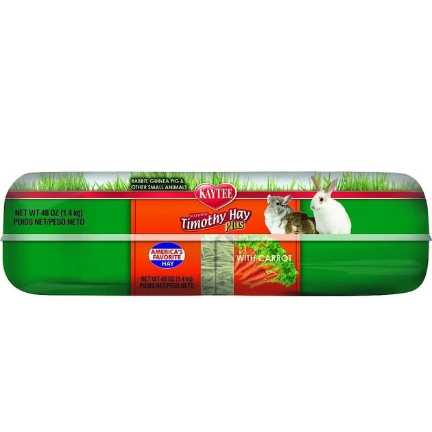 Give your pet the benefits of high-fiber timothy hay and crunchy, healthy carrots with Kaytee Timothy Hay Plus Carrots Small Animal Food. Small pets including Guinea Pigs, rabbits and chinchillas need hay to aid in the digestion process, keep their teeth trim and satisfy their need to chew. In fact, hay should make up 75 percent of their daily diet. Kaytee Timothy Hay Plus Carrots Small Animal Food is natural, chemical free and made simply with only sun-cured timothy hay and dried carrots. Carrots are rich in beta carotene and other vitamins and provide a more challenging chew than regular bale hay. Offer several times a day as a treat in addition to their regular hay supply.