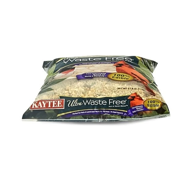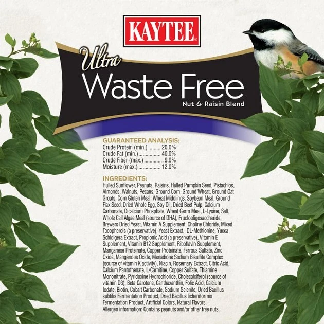 Leave your local birds chirping for more with Kaytee Ultra Waste Free Nut & Raisin Blend Wild Bird Food! Made in the USA for quality you can trust, this wild bird feed is fortified with a mix of hulled sunflower and pumpkin seeds, peanuts, mixed nuts and raisins. This energy-rich formula helps attract woodpeckers, juncos, cardinals, grosbeaks, finches, chickadees and more while also attracting special birds that enjoy a diet of nuts and berries. Plus, this 100% edible mix leaves behind zero messy leftovers under feeders, in yards, in flower beds and on patios.