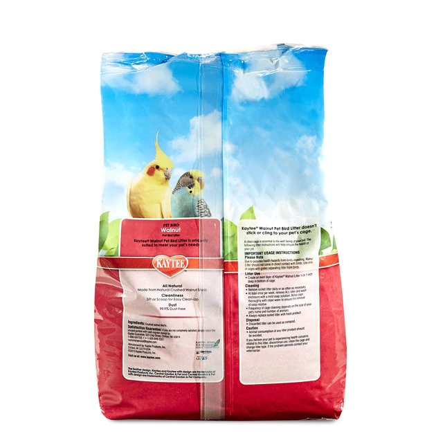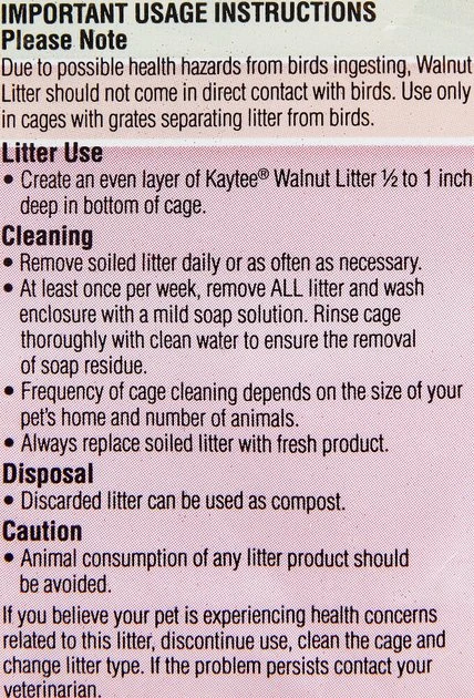Keep your pet’s habitat dry and odor free with Kaytee Walnut Natural Bird Litter. Despite a reputation for being smelly, birds are actually fastidious. Odor is often caused by poor quality litter or infrequent habitat cleanings. Kaytee Walnut Natural Bird Litter is made of natural crushed walnut shells that are highly absorbent and help eliminate odors. And because it doesn’t stick or cling to cages or habitats, it makes cleaning easy. Use as litter in cages with grates separating litter from birds. Kaytee Walnut Natural Bird Litter should not come in direct contact with birds due to health concerns from potential ingestion.